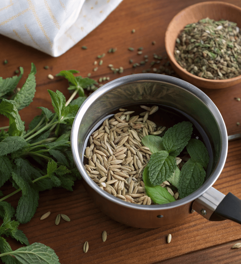 Porta l’acqua ad ebollizione, aggiungi i semi di finocchio e la liquirizia, poi fai sobbollire per 5 minuti. Spegni il fuoco, aggiungi le foglie di menta e lascia riposare per 5 minuti. Infine filtra il composto e aggiungi un cucchiaino di miele a piacere.