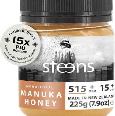 Puro miele di Manuka neozelandese, grezzo al 100% e certificato UMF 15+ con MGO 515+. Un miele grezzo, dalla consistenza granulosa, il sapore pieno e potenti proprietà nutritive.